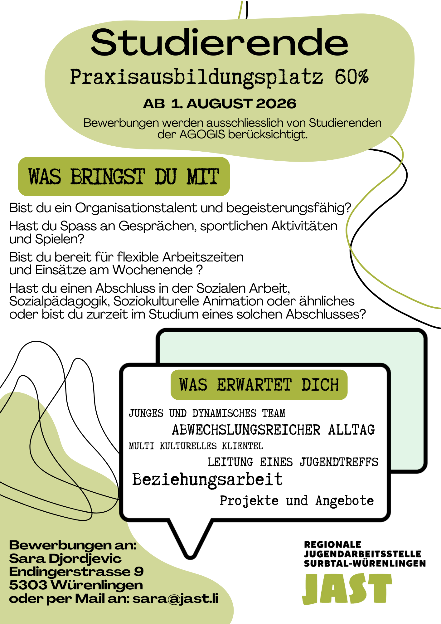 Unser Team besteht aus fünf Jugendarbeitenden. Wir sind jeweils im Jugendtreff (in Würenlingen, Endingen, Lengnau und Freienwil), in der kirchlichen Jugendarbeit, an öffentlichen Anlässen, Projekten und im Büro der JAST in Würenlingen (neben dem Blumenhäuschen) anzutreffen.